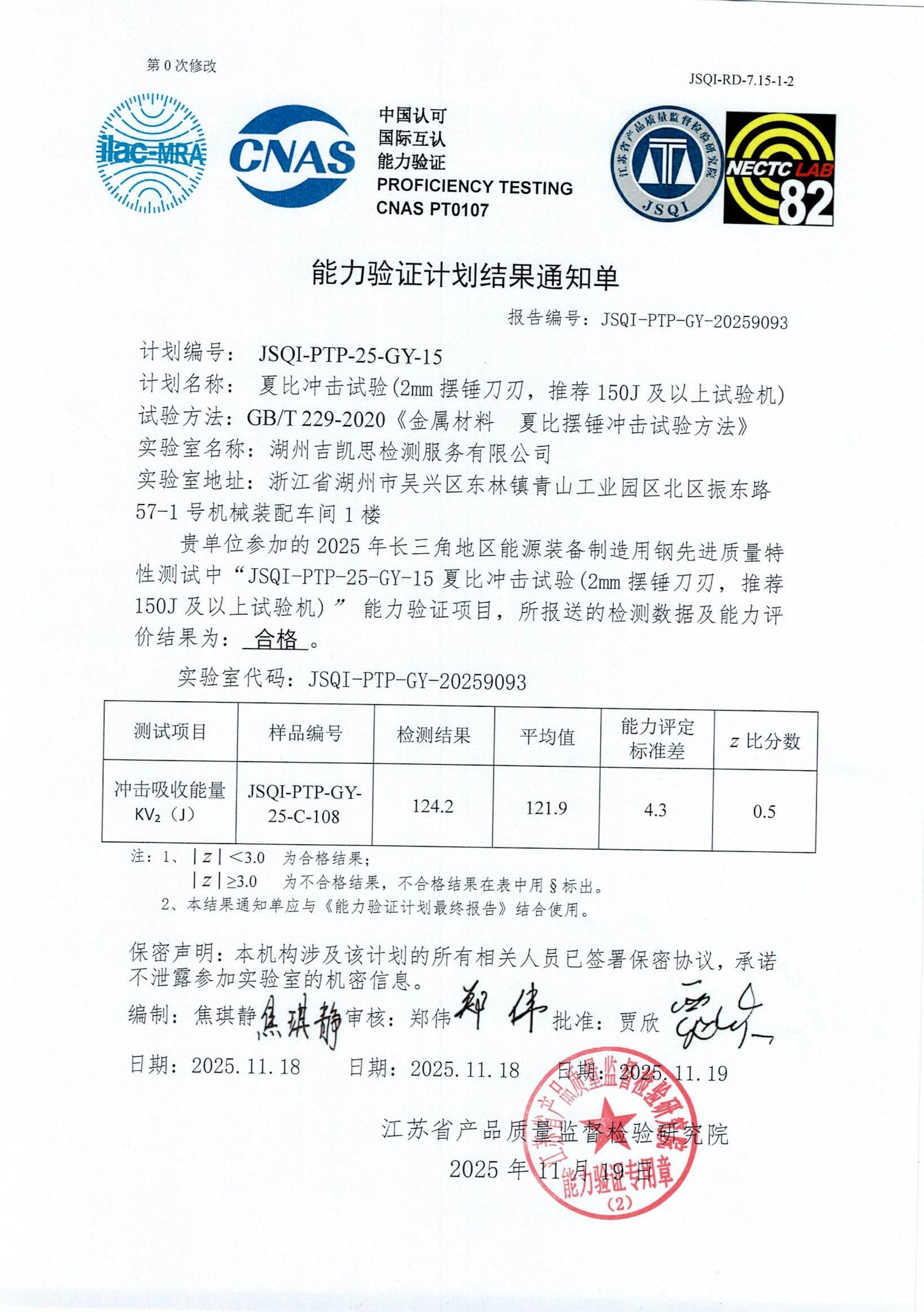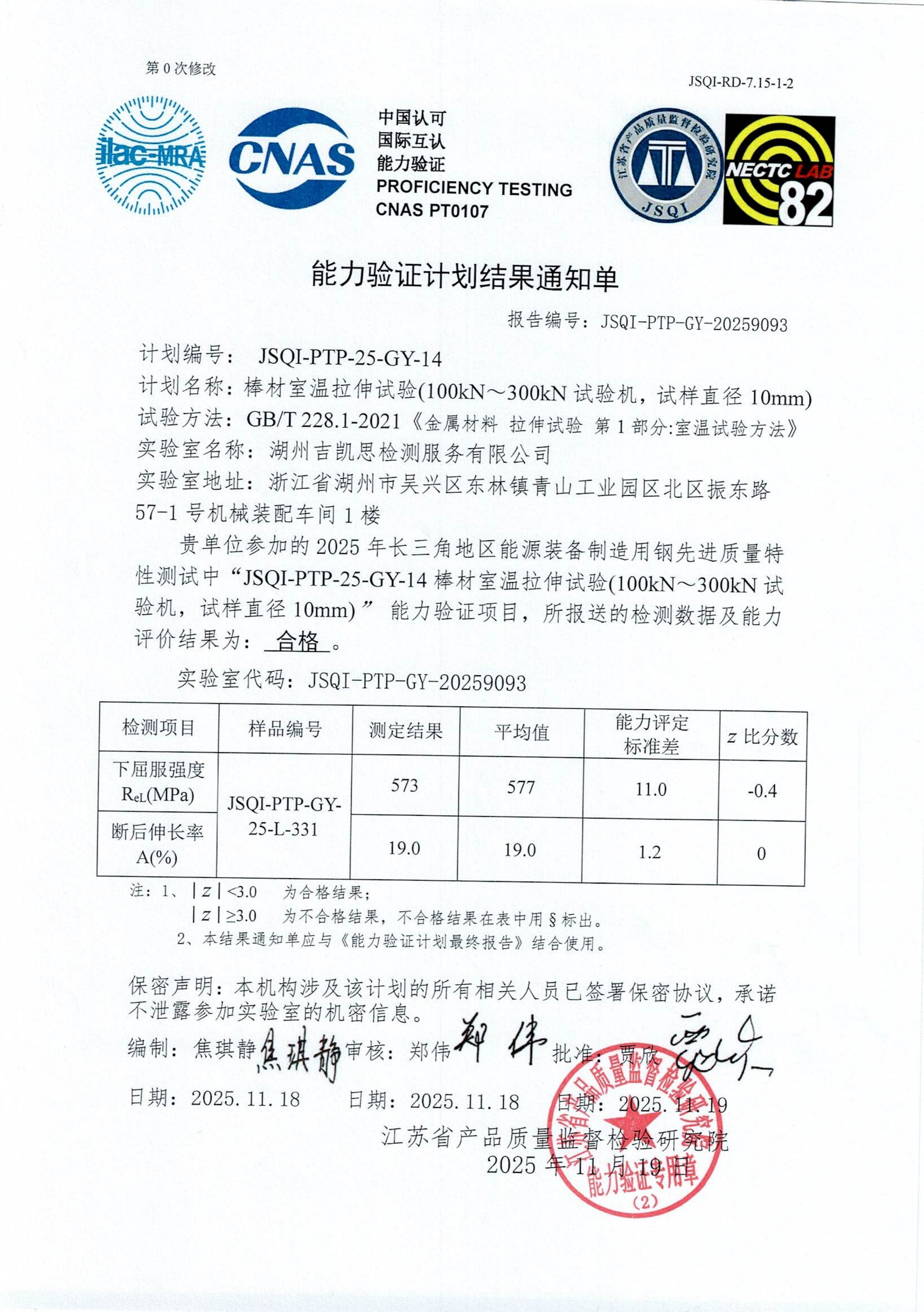 湖州吉凱思檢測服務(wù)有限公司憑借先進(jìn)的檢測設(shè)備、專業(yè)的技術(shù)團(tuán)隊和嚴(yán)謹(jǐn)?shù)馁|(zhì)量管理體系,在本次能力驗證中表現(xiàn)優(yōu)異,各項檢測結(jié)果均符合標(biāo)準(zhǔn)要求。這一成績不僅是對公司技術(shù)能力的肯定,也為公司在能源裝備制造用鋼檢測領(lǐng)域樹立了良好的品牌形象。